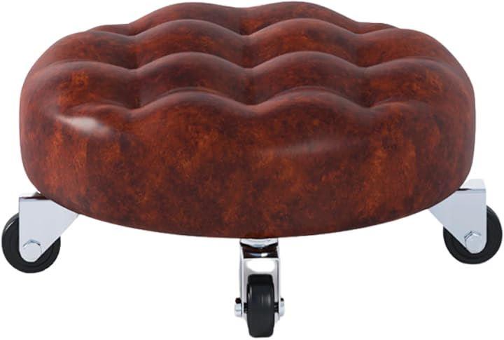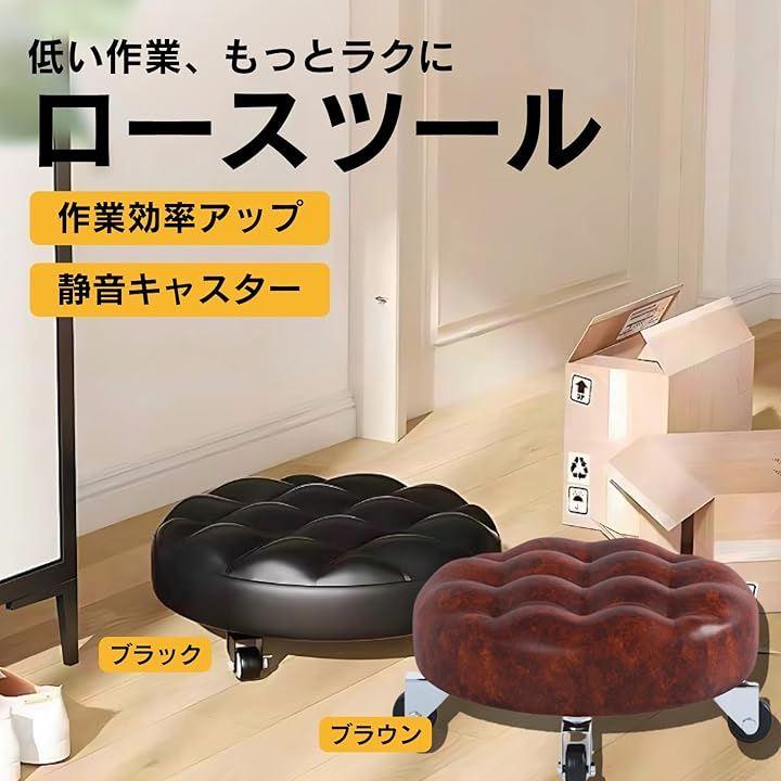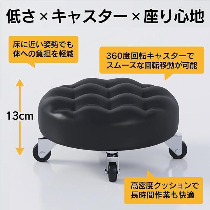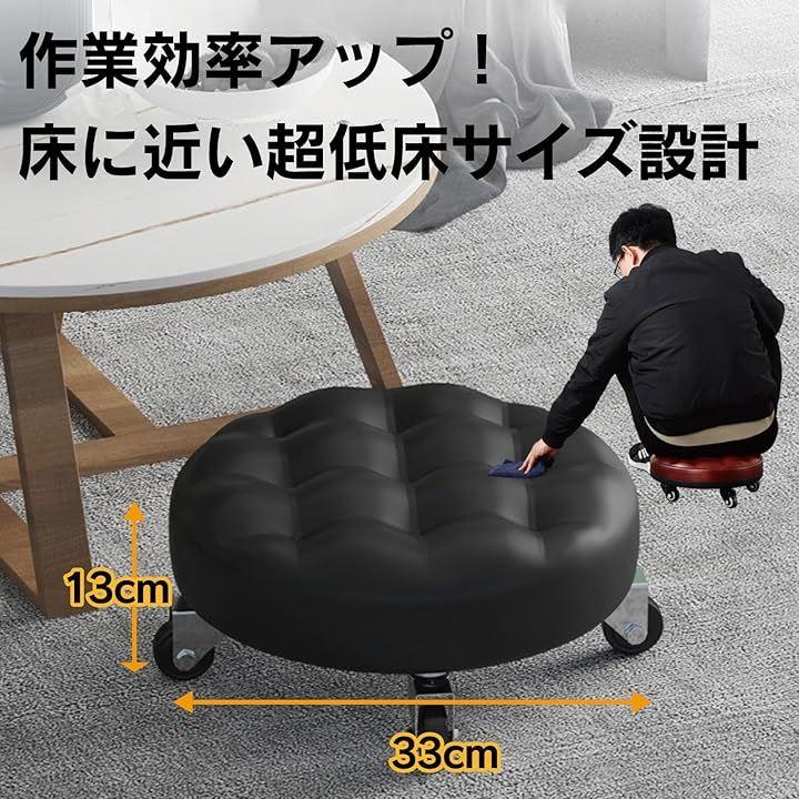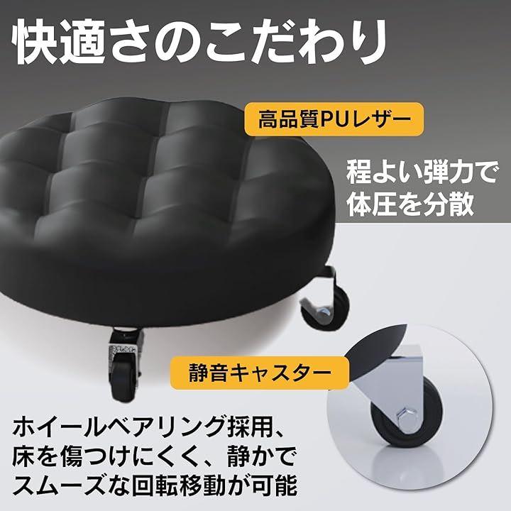 「商品仕様」タイプ:丸型・キャスター付き・低床タイプ 座面高さ:約13cm 材質:PUレザー(座面)、高密度ウレタン、プラスチックベース、ゴムキャスター