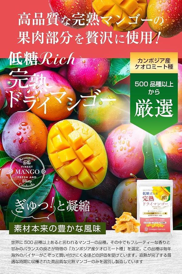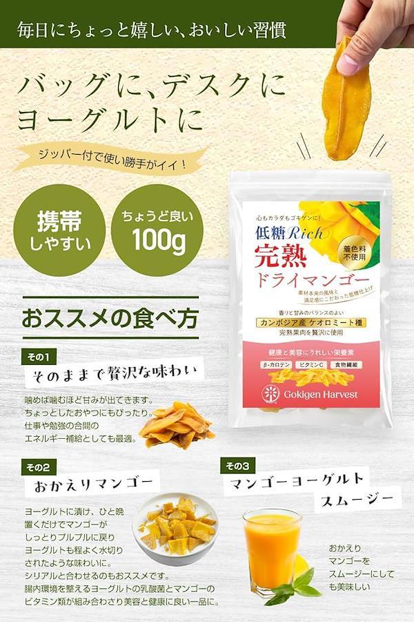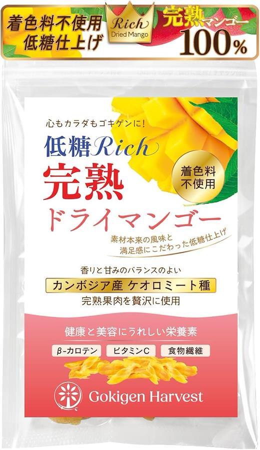 *内容量:100 g(チャック付き) *ブランド:Gokigen Harvest *商品名:低糖Rich完熟ドライマンゴー *原材料:マンゴー(カンボジア産ケオロミート種)、砂糖/クエン酸、酸化防止剤(亜流塩酸) *ジャンル:ドライフルーツ、ドライマンゴー *特徴:カンボジア産ケオロミート種の完熟マンゴーの果肉部分を厳選使用。