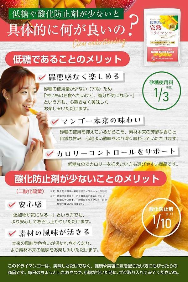 砂糖使用量はEUの低糖規格に適応し7%に抑制しており、一般的なドライマンゴー(砂糖使用量20%程度)の約1/3です。