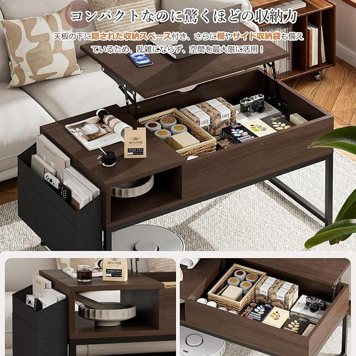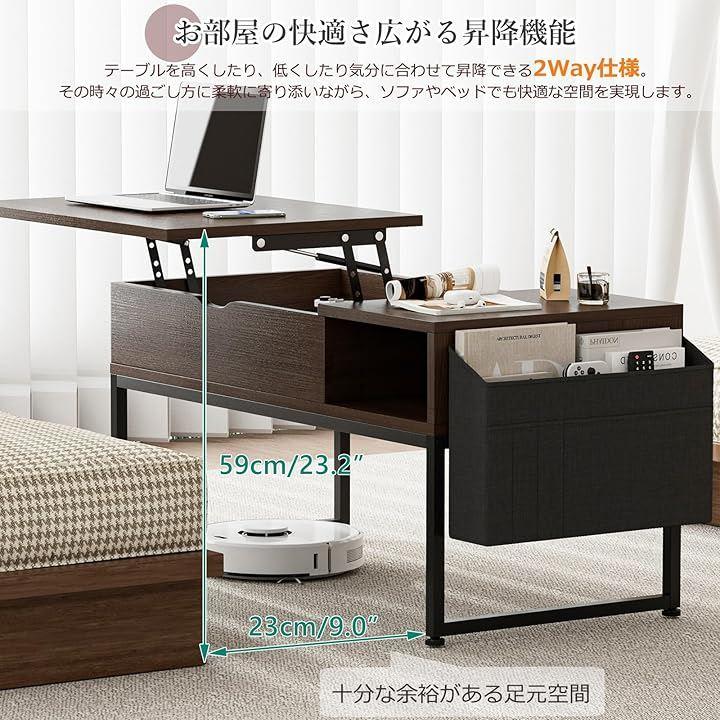 仕事や食事の際にはさっと天板を持ち上げてデスクモ一ドに。テレピを見る時リラックスタイムは天板を下ろしてロ一テ一ブルに。