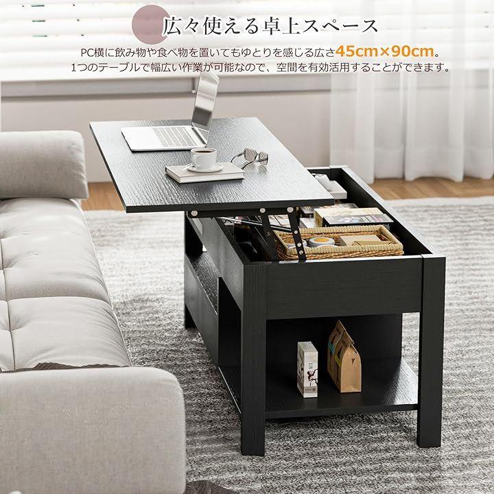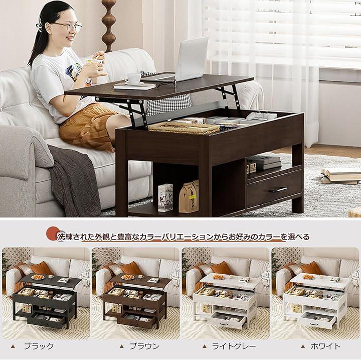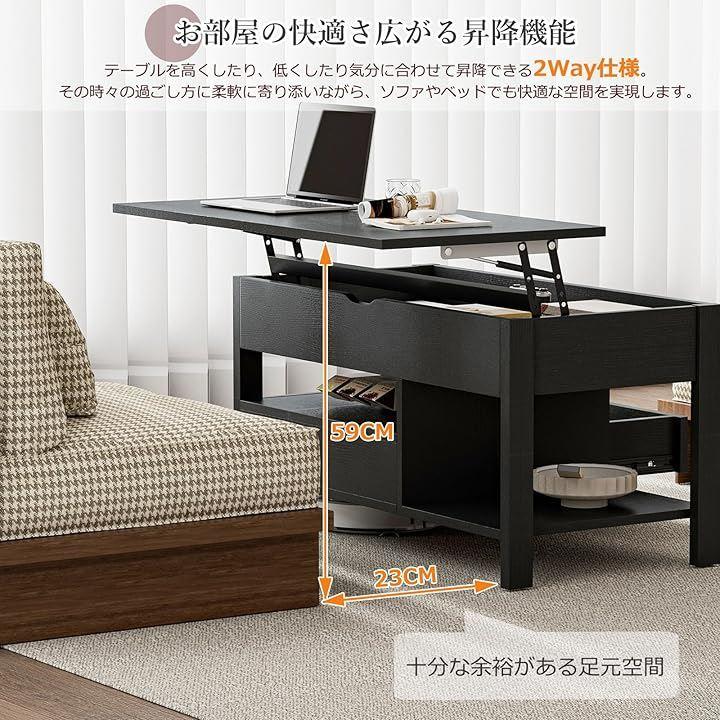 「お部屋の快適さ広がる昇降&1台2役多機能テーブル」 天板がリフトアップすることで、座ったままの姿勢でも軽いカで楽にリフトアップが可能。