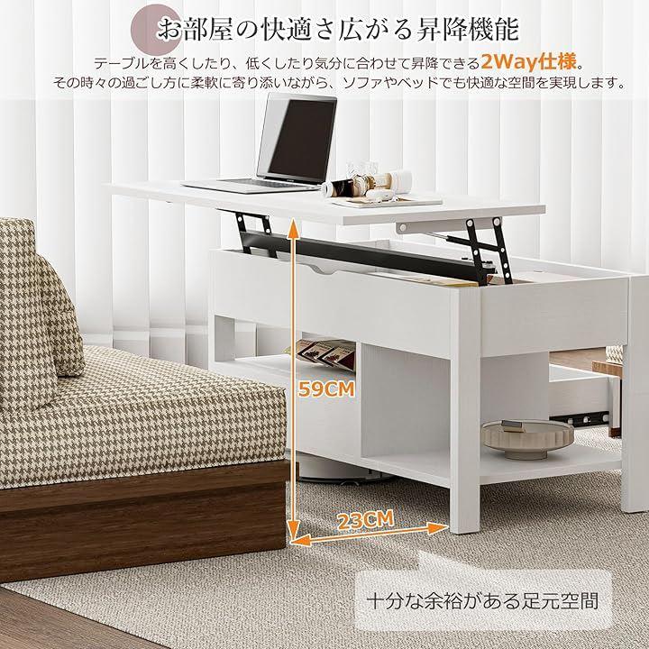 「お部屋の快適さ広がる昇降&1台2役多機能テーブル」 天板がリフトアップすることで、座ったままの姿勢でも軽いカで楽にリフトアップが可能。