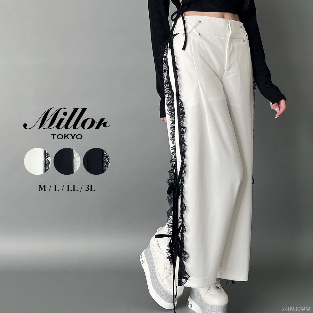 今季押さえておきたい旬顔ロングパンツ【デザイン】ローウエストでウエストまわりをすっきりさせたこちらのアイテムは、サイドスリットで美脚効果抜群。スタッズやファスナー引き手など、ところどころにハートをあしらいワンポイントに。配色のレースとルーズなシルエットが一気にこなれた印象へと導いてくれるアイテムです。履き心地がとにかく楽ちんなので、一着持っておけば大活躍間違いなしのおすすめボトムです!【素材】レーヨン混で柔らかく、なめらかな素材です。《透け感》カラーによってあり 《生地の厚さ》普通 《裏地》なし 《伸縮性》あり《生産国》中国