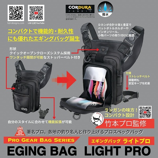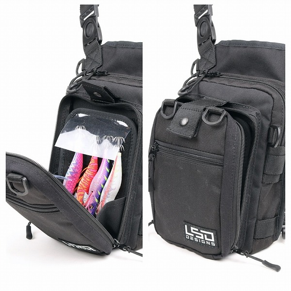 プロギアバッグシリーズ第3弾、ユーチューバーでもある竹本プロ監修のエギング専用モデル。ランガンに最適なコンパクト設計で、フロントには8本のエギを直接収納可能なショルダーフットバッグ。エギが4本装着可能な脱着式シートを2シート配置し、8本のエギを直接収納可能。(3号クラスのエギであれば合計10本収納可能)エギルームはワンタッチ開閉が可能なクイックオープンクローズシステム採用で、スピーディーなエギ交換が可能。(上部のストッパーベルトにマジックテープとホックを装備)メインルームにはエギケースMサイズクラス(20本収納タイプ)が入る容量で、さらに長財布などを入れる余裕もあり。バッグ両サイドと底面にカスタムベースを搭載し、カスタムパーツで機能拡張が可能。ペットボトルホルダーやピンオンリール 、小物パーツの取り付けに便利なDカンを8個配置。太腿に装着することでバッグが安定するストレッチサポートベルトが標準装備で、身軽なランガンが可能に。ランガンスタイルのエギンガーにおすすめで、特に小さいエギを使用する秋●冬にはベストマッチ。 H30cm x W40cm x D15cm(ショルダーベルト除く) 本体: H29cm x W24cm x D10cm(ショルダーベルト除く) ショルダーベルト: 20~130cm (幅4cm) ストレッチサポートベルト: 28~40cm (幅2.5cm) 重量: 約410g(本体387g+サポートベルト23g) 本体生地: コーデュラ610デニール ポリエステル100% フォーム (中のクッション素材): ポリエステル クリアシート: PVC ジッパー: ナイロン スライダーと引き手: 亜鉛合金 プラーコード: TPU 樹脂パーツ(バックルやDカン等): POM(ポリアセタール) ※実物と色が違って見える場合があります。あらかじめご了承下さい。