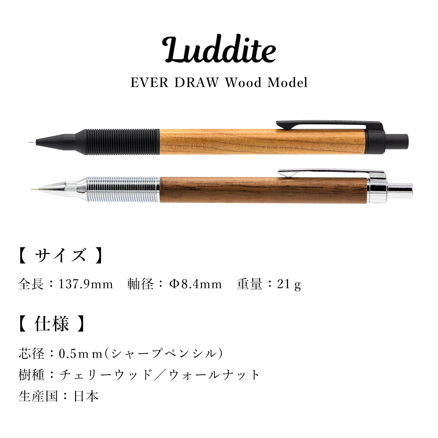 ■関連キーワードラダイト エバードロー Luddite EVERDRAW Wood Model シャーペン 高級 木製 日本製 プレゼント 男性 女性 ギフト ビジネス用 低重心 木軸 書きやすい 0.5mm シャープペンシル おしゃれ 贈り物 高級文具 文房具 社会人 就職 入学 卒業 祝い 誕生日 箱入り ステーショナリー チェリーウッド ウォールナット メンズ 大人 高校生 大学生 職場 仕事用 10代 20代 30代 40代 50代 60代 中学校 高校 大学 中学生 先生 学生 学校 入学準備 通学 通勤 息子 娘 孫 女子 女の子 レディース 男子 男の子 メンズ 父 母 おかあさん おとうさん パパ ママ バースデー プチ ミニ ギフト お祝い お返し 粗品 景品 送別会 イベント 母の日 父の日 クリスマス クリスマスプレゼント バレンタイン チョコ以外 ホワイトデー お洒落 シンプル かっこいい LDWB-MP4CW-05 LDWB-MP4WN-05 LDW-MP4WN-05 LDW-MP4CW-05