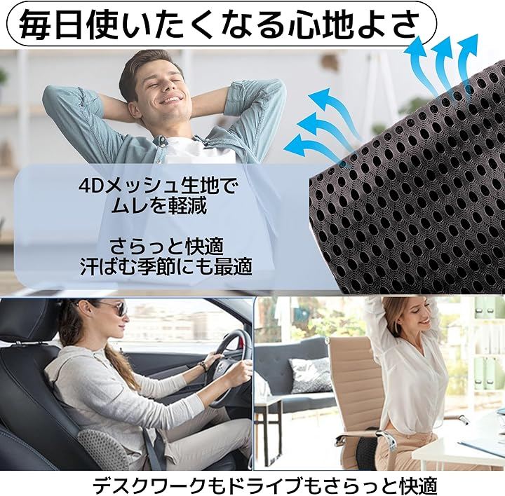 Lumbar Support, Low Rebound, 4D Mesh, for Car/Office Chairs, Pressure Distribution, Secure Belt, Breathable.