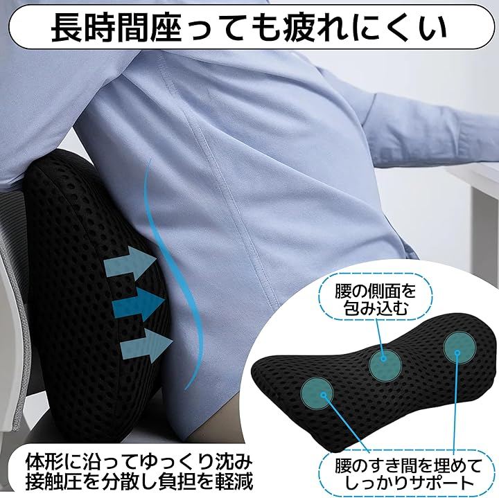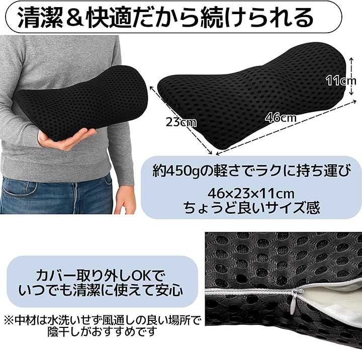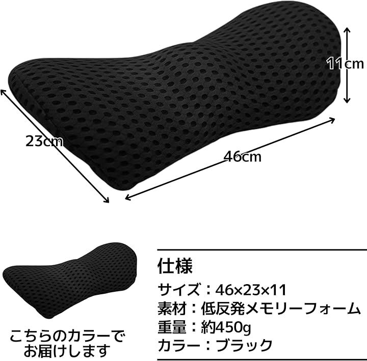 「仕様」 中材:低反発メモリーフォーム カバー:4D(立体)メッシュカバー(取り外し可・お手入れ可) 付属:固定バンドx1 サイズ:46x23x11cm(測定方法により±約2cm) 重量:約450g カラー:ブラック 用途:椅子/オフィス/自宅/車の運転席・助手席
