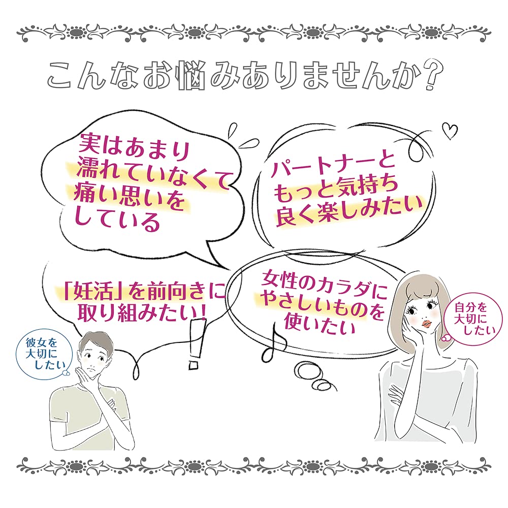 ?【快楽のうるおい、なのに安心安全】挿入の違和感、高齢の方の潤い不足、営みを頑張りたい方、お肌の弱い方にオススメ。女性や男性のデリケートゾーンに「安全なものを使いたい」という声に応えました。敏感肌の女性向け潤滑剤ゼリー(潤滑ゼリー・ラブローション・妊活ゼリー・潤滑剤・ローション)です。男性からも人気です。 ?【安心の敏感肌用 潤滑ゼリー】敏感肌対応パッチテスト済。膣やお肌に安心して使えるように皮膚学やアレルギーなどを研究する「ドイツ皮膚学研究所」で評価認定された安全な成分も使用した潤滑ゼリー。なめても安全で、無味無臭タイプ。弱酸性・水溶性・低刺激性の潤滑剤ゼリーです。 ?【長時間うるおうのに、洗い不要】落ちにくさの原因となる「ポリアクリル酸」を含まないため、使用後にそのまま寝てもベタベタ、カピカピが残らない洗い不要の水溶性です。気になる方はシャワーでサッと落とせます。化粧品認定の潤滑剤ゼリーですのでベッドも汚しません。 ?【8種の無添加】合成香料、合成着色料、合成ポリマー、アルコール、紫外線吸収剤、フェノキシエタノール、パラベン、鉱物油が不使用。女性に寄り添った日本製の潤滑ゼリーです。 ?【お一人様にもオススメ】スキンやラブグッズにも相性抜群。パートナーとの営みはもちろんお一人様にも快楽の潤いをお届けする潤滑剤ゼリーです。マッサージ用のジェルとしてもご活用いただけます。 ?【ぬくもりのひと肌温感】寒い日もヒアルロン酸の摩擦により、ほんのり温かなひと肌になる温感タイプの潤滑ゼリーです。 ?【プライバシーを徹底保護】一般的な梱包材を使用し、宛名には商品名の記載もないので、外から中身を知られることはありません。SDGsの観点から化粧箱はお付けせずに、ボトル容器のみでのお届けとなります。ご了承くださいませ。潤滑ゼリーのボトル容器はフィルム包装してございますので、清潔にご使用いただけます。