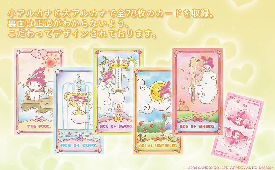 (株)サンリオの大人気キャラクター【マイメロディ】がタロットカードとしてルナファクトリーより発売されます! 重厚感のあるハードボックス仕様に加え、初心者にもわかりやすいとても丁寧なブックレット付。 カードは78枚で作られていますので、本格的なタロット占いで使用できます。 ブックレットは英語訳も書かれていますので、世界中の方にも親しんで頂ける作り。 小アルカナと大アルカナで全78枚のカードを収録。 裏面は正逆がわからないよう、こだわってデザインされております。 デザイナーが1枚1枚こだわって丁寧に作成したデザインは、マイメロディの世界をタロットカードの世界観に落とし込みつつ可愛く表現しています。 細部までこだわって描かれていますので、いつ眺めても常に新しい発見があり、あなたのリーディングのインスピレーションを最大限に引き出してくれるでしょう。 初心者からタロットカードに慣れた人まで、多くの方にお使いいただけるタロットカードです。 マイメロディと一緒に楽しい占いを始めてみましょう!