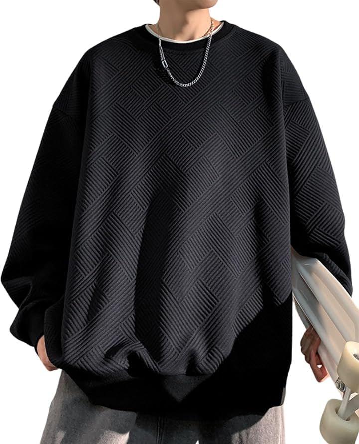 Lune Non Soleil Men's Fluffy Sweatshirt, Long Sleeve, Plus Sizes, Solid Color, Loose Fit, Crew Neck, Waffle Pattern, Men's Clothing for Men in their 40s