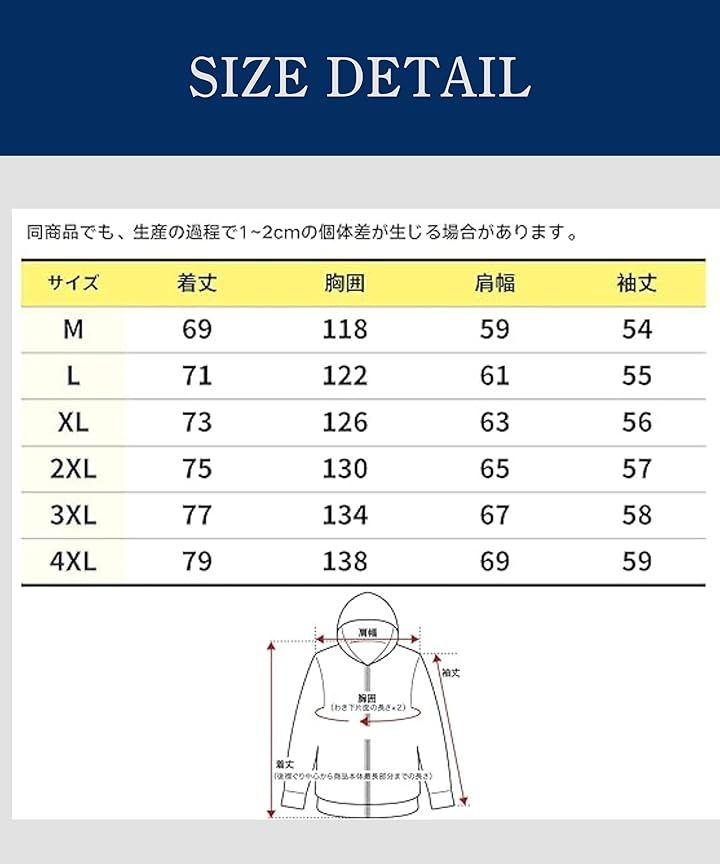 「品質・サイズ」:ポリエステル100% *カラー:グレー、ブラック、ブルー *「L」胸囲:112~116cm 身長:165~170cm「XL」胸囲:117~121cm 身長:170~175cm「2XL」胸囲:122~126cm 身長:175~180cm「3XL」胸囲:126~130cm 身長:180~185cm