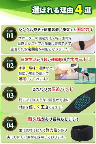 【注意点】重量物を扱ったり、ハードな筋力トレーニングにはサポート力が足りない可能性があります。その場合は姉妹商品の2重巻きタイプの肘サポーターをお選び下さい。 ?【専門家監修の肘サポーター】専門家の監修のもと肘サポーターを作製致しました。肘の専門家だからこそわかる肘の悩みや肘のケガ対策のポイントを抑えたサポーターです。 ?【3つの効果と強み】LURE(ラーレ)の肘サポーターをご使用になると、「肘が楽で快適になる」「肘の不快感を抑制できる」「テニス肘の対策になる」の3つの強みがあります。シングル巻きでも安定して固定ができる肘サポーターです。 ?【従来品の問題を改善!】肘サポーターを改善したことで、「シングル巻き(1枚巻き)タイプでも強い固定力」「適切なサポーター幅で安定する」「日常生活でも使用しやすいサポーター(厚みが少ない)」の3つを実現しました。従来品に比べて、より快適にご使用できる肘サポーターになりました。 ?【あらゆる場面で活躍します】LURE(ラーレ)の肘サポーターは、テニス・ゴルフ・バドミントン・仕事・釣り・軽いトレーニング・家事など、あらゆる場面で活躍できて、スポーツ選手や子供から大人まで幅広い人に適用される肘サポーターになります。 ?【皆様に選ばれる4つの理由】LURE(ラーレ)の肘サポーターは、「シングル巻きでも安定した高い固定力」「こだわりの圧迫パッド」「耐久性があり長持ちする素材」「動きを阻害しないサポーター幅」の4つの選ばれる理由があります。 ?【意匠出願中!】LUREの肘サポーターは専門家監修のもと作製したオリジナル商品です。こだわりの商品設計でサポーターの効果をシンプルに最大限引き出せる仕様になっております。