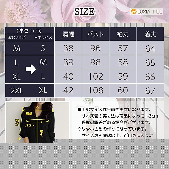 「サイズ」(肩幅/バスト/袖丈/着丈)M(S):38/96/57/64L(M):39/98/58/65XL(L):40/102/59/662XL(XL):42/108/60/67単位:cm*上記サイズは平置き実寸になります。