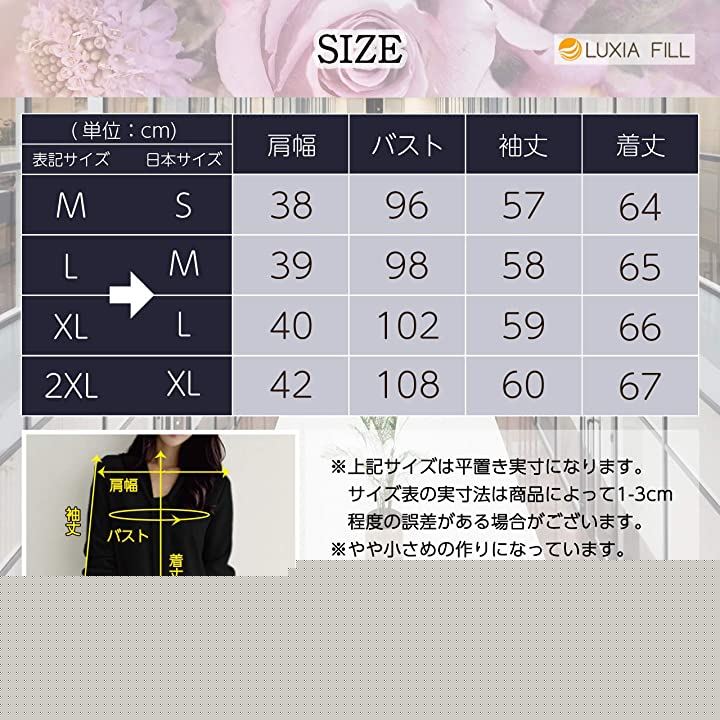 「サイズ」(肩幅/バスト/袖丈/着丈)M(S):38/96/57/64L(M):39/98/58/65XL(L):40/102/59/662XL(XL):42/108/60/67単位:cm*上記サイズは平置き実寸になります。