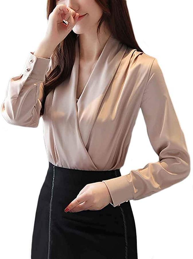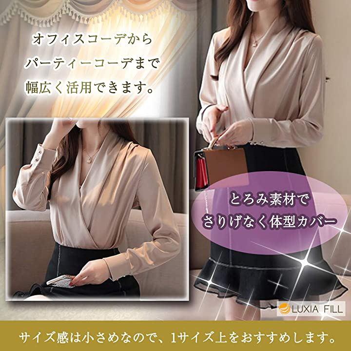 ・光沢のあるサテン生地でエレガントな装いにぴったりのドレープブラウスのご紹介です。
