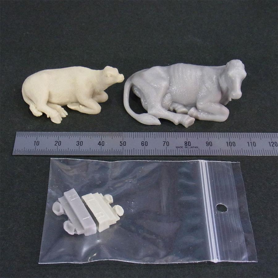 Lying Skinny Cow with Calf 横たわる牛と子牛完成サイズ:体長 親牛 約6cm、 子牛 約5cm材質:レジン(未塗装)※耳部分は別パーツです。