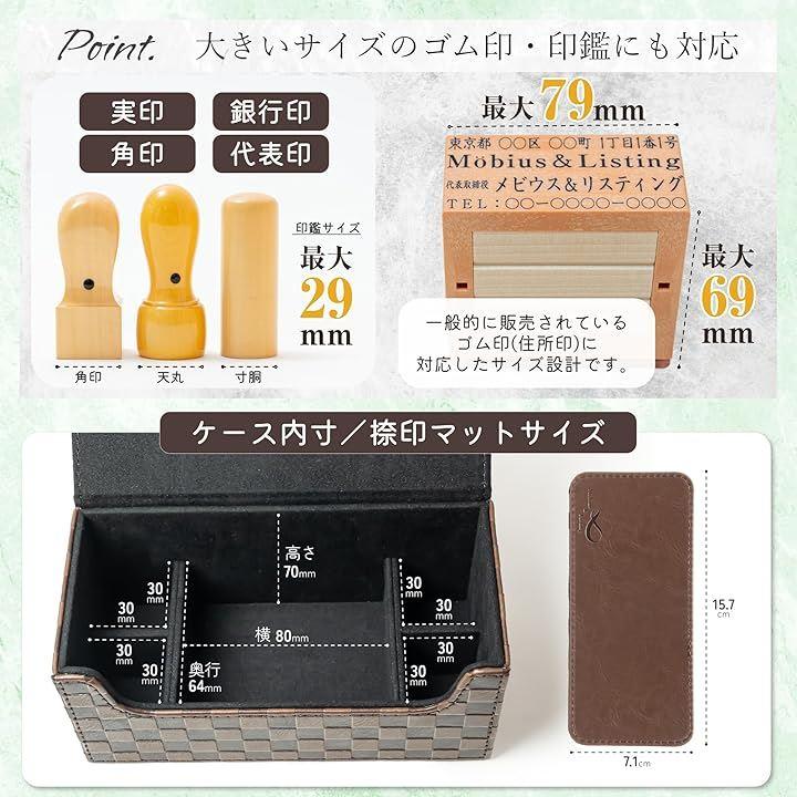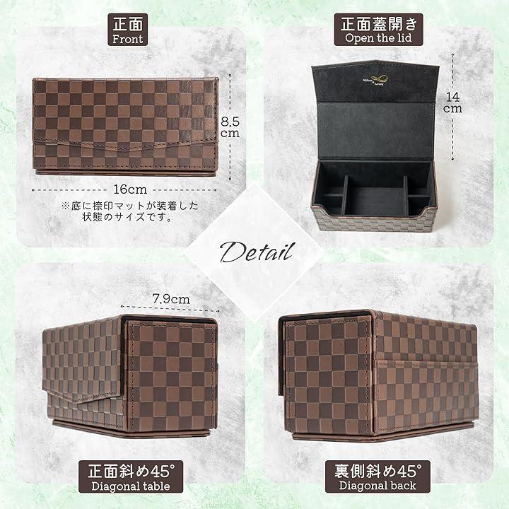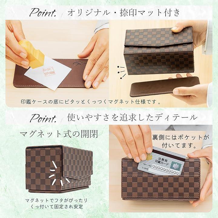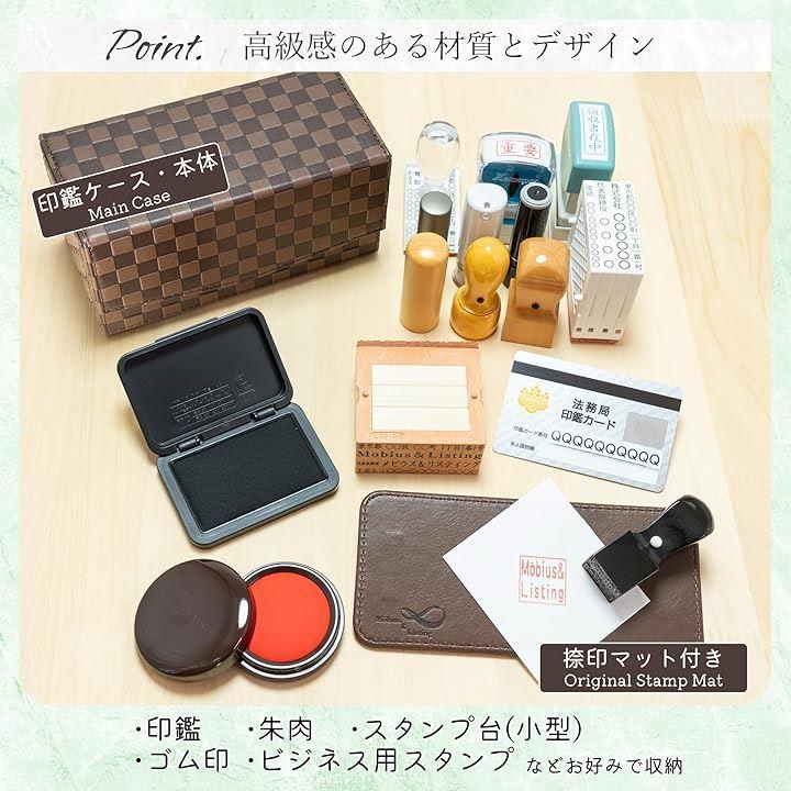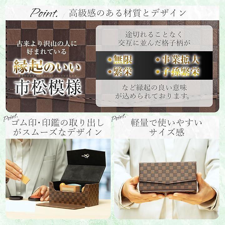1.法人・会社・お店・店舗・個人事業主・自営業者・フリーランスなどの印鑑(実印・代表者印・銀行印・角印・役職印・認印)、ゴム印(住所印・組み合わせ印・親子印)、ビジネス用スタンプ、朱肉を収納するための、ハンコケース(印箱・印鑑収納ボックス) 2.商談、取引、契約などのビジネスシーンで活躍するスタイリッシュなデザイン 3.商売繁盛など、縁起の良い市松模様
