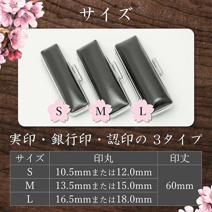 魅力のポイントは3つ (1)本牛革の艶と光沢の重厚感 (2)内張の桜模様が、和の心を表現する日本人らしさ (3)一貫した自社製造・職工による手作業、高品質な真鍮、品質第一の精神 認印・銀行印・実印に対応するたサイズは3タイプご用意 「S」10.5mm~12.0mm・「M」13.5mm~15.0mm・「L」16.5mm~18.0mm ご自身用としても贈り物としても大切な印鑑を守る、メイドインジャパンの印鑑ケースはきっと気にって頂けると考えてます。
