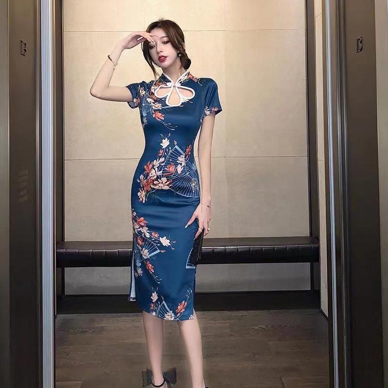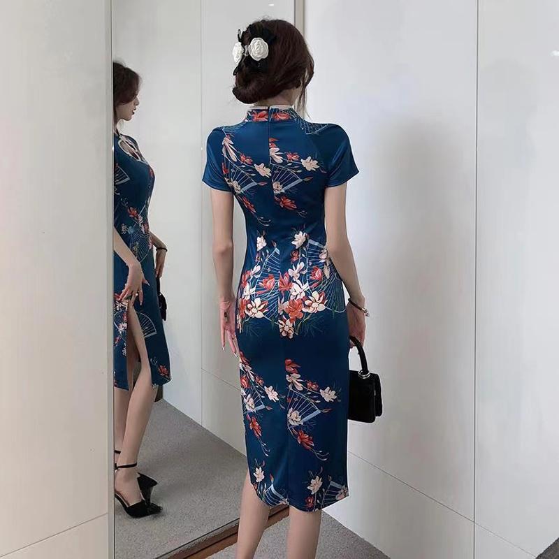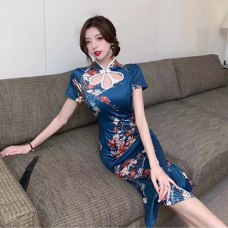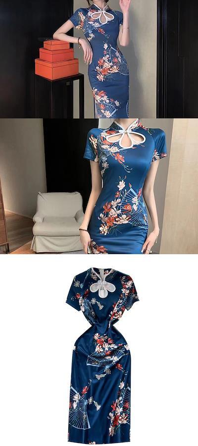 ネックのデザインが特徴的なセクシー紺地の花柄チャイナドレス、脚魅せのサイドスリットがセクシー♪着心地がいい、ストレッチも効いて楽ちん。商品内容:チャイナドレス
