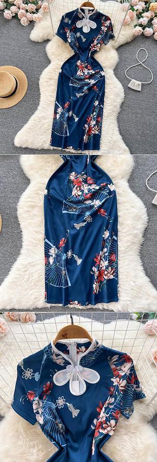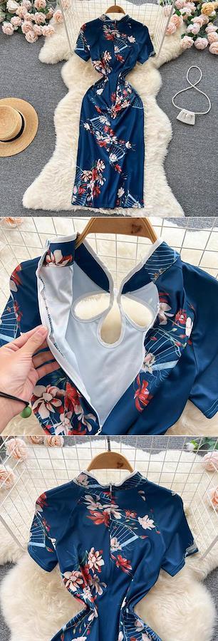 ・柄の出方は商品毎に異なります。・裏地なし・スリットあり・胸パッドなし・ストレッチよく伸びます・透けません・首元チャイナボタン開閉可・着用しやすい背中ファスナー・ネイビー色・素材:ポリエステル