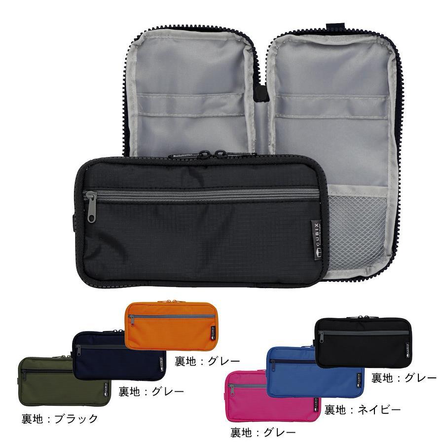 マルチに使えるラウンドジップペンケースは、オレンジ・ネイビー・カーキ・ブラック・スカイブルー・チェリーピンクの6色展開。