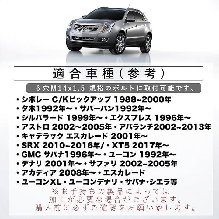 「適合車種(参考)」 シボレー :C/Kピックアップ 1988~2000年/ タホ 1992年~/サバーバン 1992年~/シルバラード 1999年~/ エクスプレス 1996年~/アストロ 2002~2005年/アバランチ 2002~2013年 キャデラック:エスカレード 2001年~/SRX 2010~2016年/XT5 2017年~ GMC: サバナ 1996年~/ユーコン 1992年~/デナリ 2001年~/サファリ 2002~2005年/アカディア 2008年~ エスカレード / SRX / タホ / サバーバン / アバランチ / シルバラード / エクスプレス / アストロ / トラバース / アカディア / ユーコン / ユーコンXL / ユーコンデナリ / サファリ / サバナ / シエラ 等 6穴 M14x1.5 規格のボルトに御取付頂けます。