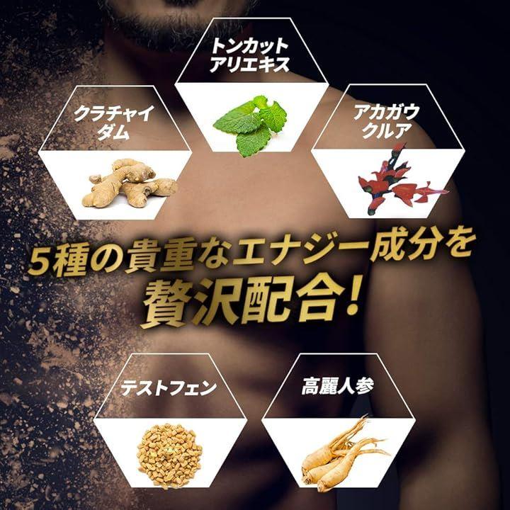 5種の貴重なエナジー成分を贅沢配合。・亜鉛(グルコン酸亜鉛)・クラチャイダム・トンカットアリエキス・アカガウクルア・テストフェン(フェヌグリーク種子)・高麗人参伝統的な成分に加え、近年注目されている新エナジー成分を配合しました。厳選成分配合。・ヒハツエキス・ゴツコラエキス・カツアバエキス・BCAA(バリン・ロイシン・イソロイシン)・L-アルギニン、L-シトルリン、ビタミンE・ビタミンB6・クエン酸余計な添加物を一切含まず、相性の良い形で成分を厳選配合しました。