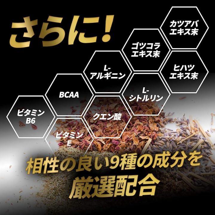 ・クラチャイダム、トンカットアリ、シトルリン、アルギニン、アカガウクルア、ソフォン(フェヌグリーク種子)、高麗人参、ゴツコラエキスなどエナジー成分を贅沢配合。