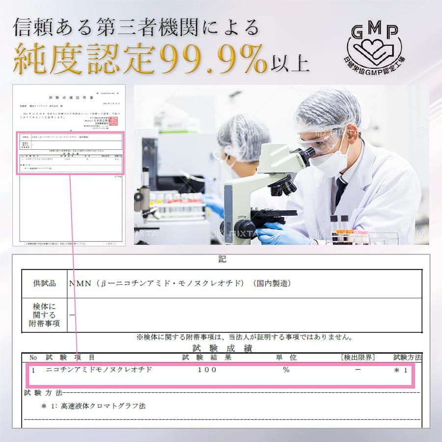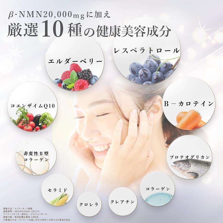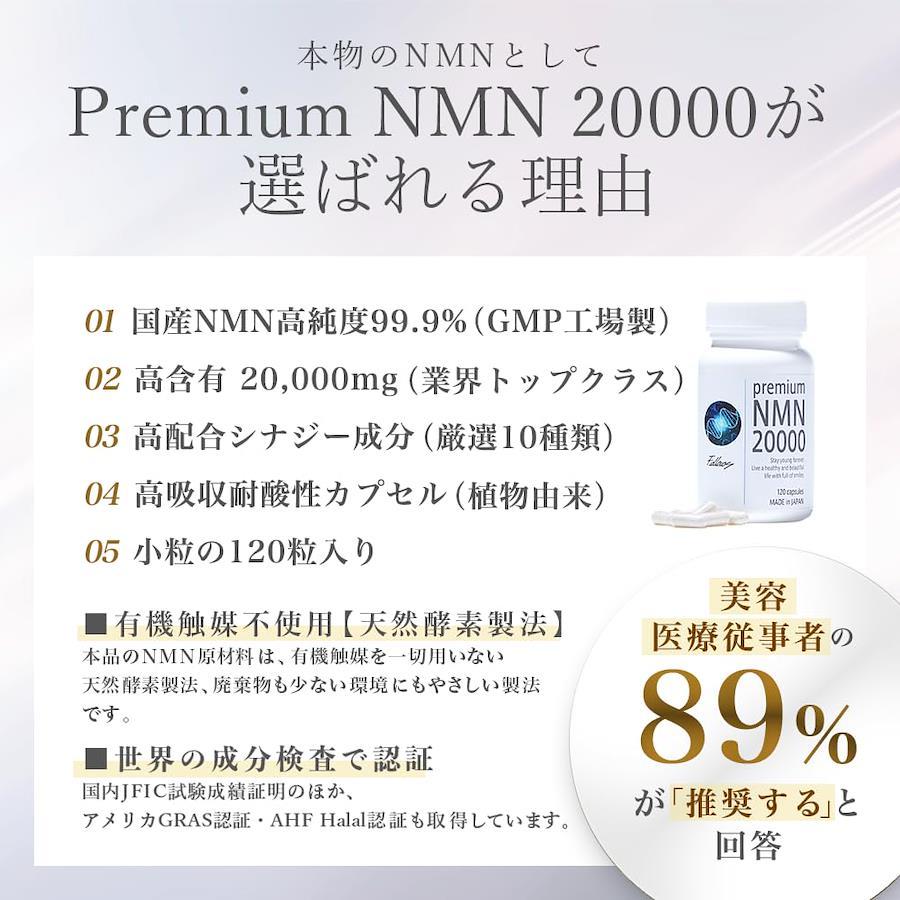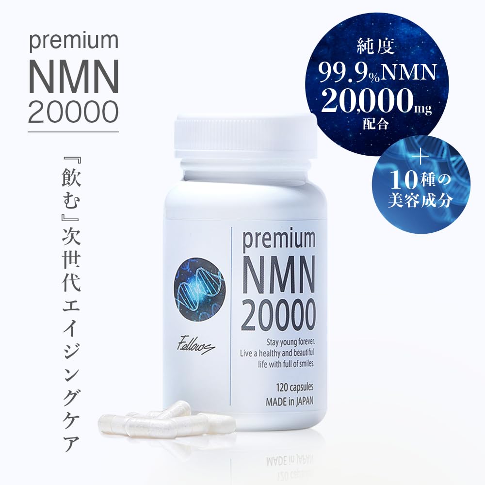 ■サイズ:??4.5x4.5x8.5cm;60g ?【健康と美を追求】Premium NMN20000は、一瓶120粒で業界トップクラスのβ-NMN20,000㎎。さらに10種類の美容成分を贅沢に配合。美と健康を追求する方に最適です。 ?【国産β-NMN99.99%】国内製造β-NMN(β-ニコチンアミドモノヌクレオチド)を、一瓶に20,000mg(166.7㎎×120カプセル)と高配合。厚生省認定の第三者機関による試験で「高純度99.99%」が証明されています。●【国内GMP認定工場】Premium NMN20000は、安心の国内GMP認定工場製、医薬品の製造ラインを使用して徹底した品質管理で作られています。●【有機触媒不使用】本品のNMN原材料は、有機触媒を一切用いない 天然酵素製法、廃棄物も少ない環境にもやさしい製法です。999のNMNは毎日口にするサプリメントの、安心・安全・信頼の品質を徹底的に追及しています。 ?【10種の美容成分ALL in One】レスベラトロール・エルダーベリー・非変性コラーゲン・プロテオグリカン・コエンザイムQ10・β-カロテン・コラーゲン・セラミド・クレアチン・クロレラ。厳選10種の美容成分を惜しみなく配合した。特に今注目の美容成分レスベラトロールは、NMNと合わせて摂取することで、さらに有用性が増す研究成果が報告されています。 ?【植物由来・酸化チタン不使用】 Premium NMN20000が採用したカプセルは、医薬品でも定評あるCapsgel社製の植物由来カプセル。無着色透明で酸化チタン不使用の安心品質です。 ●【耐酸性カプセルで吸収率3倍*】しかも胃で溶けない耐酸性カプセルですから、腸まで届いて吸収率が3倍*(*当社比)。NMNは胃酸に弱いので、例え同じ量を飲んでもカプセルの耐酸性性能の差で吸収量がまるで変ってきます。 ?【NMNとは?】正式名称は「ニコチンアミドモノヌクレオチド」。若々しく健康的な体を維持するのに重要な役割を果たすことが知られている成分です。NMNは母乳にも含まれる成分で、若い時には体内で自然に作られますが、加齢に伴って減少し、50代では20代の時の約半分になり、年齢を重ねるにつれてどんどん減って行ってしまいます。これれが老化の大きな原因であることが研究によって明らかになってきました。 ●【ハーバード大学での研究】NMNは近年になって、ハーバード大学、ワシントン大学、慶応大学などでの先進的な研究成果が発表され、健康と美容の側面から世界中の注目を集めています。 ●【お召し上がり方】 Premium NMN20000は小粒のカプセル120粒入りですから、1日に4粒を目安に、水やぬるま湯でお飲みください。毎日4粒で1日750㎎のNMNが摂取出来て、ちょうど1月分です。あるいはお2人で一日2粒ずつ(333mg/日)でも十分な摂取量です。刺激性物質ではないので、朝昼夜いつお飲みいただいてもかまいません。生活のリズムに合わせて、ご都合の良いお時間に忘れずにお飲みください。