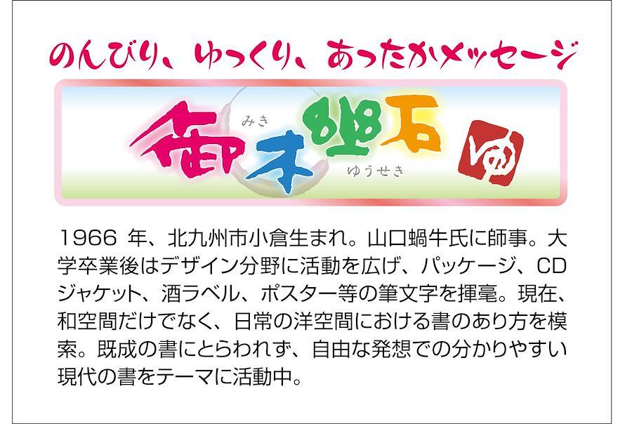 あたたかな作風ですべての人が癒される。和空間だけでなく日常の洋空間における書のあり方を模索。既成の書にとらわれず、自由な発想でのわかりやすい現代の書をテーマに活動中