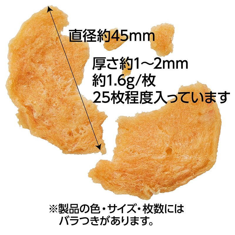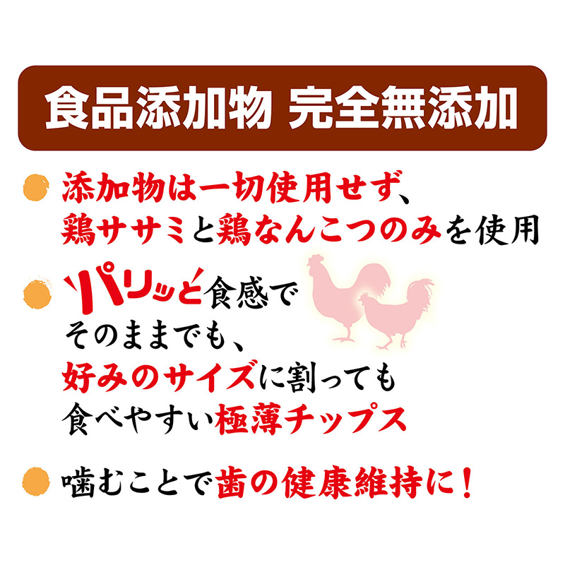食品添加物完全無添加、鶏ササミと鶏なんこつのみを使用しました。パリッと食感でそのままでも、好みのサイズに割っても食べやすい極薄チップス。