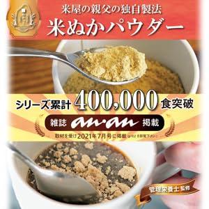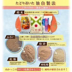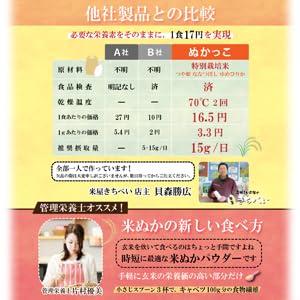米屋の店主が、妊婦さんでも安心して食べられるように製品の安全性にとことん拘りました。米屋にしかできない、他では真似のできない拘りの製法をご紹介します。 米ぬかは精米して一日後には酸化します。熱処理すると問題ないと言われますが、雑菌は増え続けぬか臭さも出てきます。精米当日の出来たての米ぬかを特殊加工したふるいに掛け サラサラしてきれいな米ぬかだけを取り分けます。(米ぬかにはぬか玉や小米、時には籾殻が入っています)取り分けられたきれいな米ぬかを、その日のうちに熱処理しますので米ぬかは酸化しません。通常の食べる米ぬかは1度の熱処理ですが、 当店は更に一手間、その熱処理済みの米ぬかを飲みやすいように粉砕し(粗いと飲みづらく細かいと効果が半減します)再度熱処理します。 熱処理を2回しても精米当日に加工しているので、製品100g当りの食物繊維・脂質(米油の元)は当社比ですが、No1の含有量を誇っています。精米当日に加工している証として、当店だけは原料のお米の品種・お米の精米日・加工日を記載しています。(安心・安全な製品の証明です) 大切な栄養分を損なわず 風味豊かな美味しい米ぬかはこうして出来上がります。 米屋の店主がとことん拘った「食べる米ぬか ぬかっこ」をどうぞごお試し下さい。 自然食品なので用法・用量はお好みですが、お身体の調子に合わせてお食べ下さい。お客様の声として、下痢するとお止めになった方・お医者様と相談して1ヵ月600g食べられている方など居ます 。 高温多湿・直射日光をさけ、タッパなど密閉容器(空気に直接触れさせなければ大丈夫です)に入れて常温保存できます。日本食品分析センターにて精米当日加工製品の2日後の検査数値と常温1年3ヶ月作り置きした製品の一般細等など食品検査数値で安全性を確認しております。タッパやジップ付きの袋で直接空気に触れさせないようにし 常温で1年は安心して美味しく召し上がれます。(食品なので頻度良く買われることをお薦めしております)