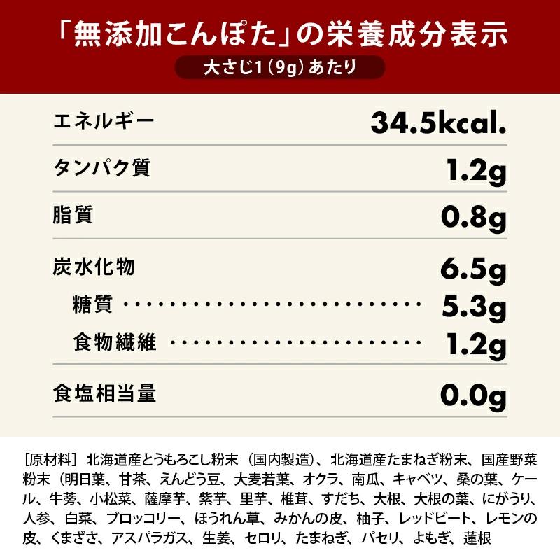 原材料北海道産とうもろこし粉末(国内製造)、北海道産たまねぎ粉末、国産野菜粉末(明日葉、甘茶、えんどう豆、大麦若葉、オクラ、南瓜、キャベツ、桑の葉、ケール、牛蒡、小松菜、薩摩芋、紫芋、里芋、椎茸、すだち、大根、大根の葉、にがうり、人参、白菜、ブロッコリー、ほうれん草、みかんの皮、柚子、レッドビート、レモンの皮、くまざさ、アスパラガス、生姜、セロリ、たまねぎ、パセリ、よもぎ、蓮根)