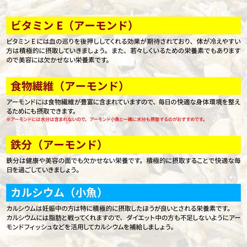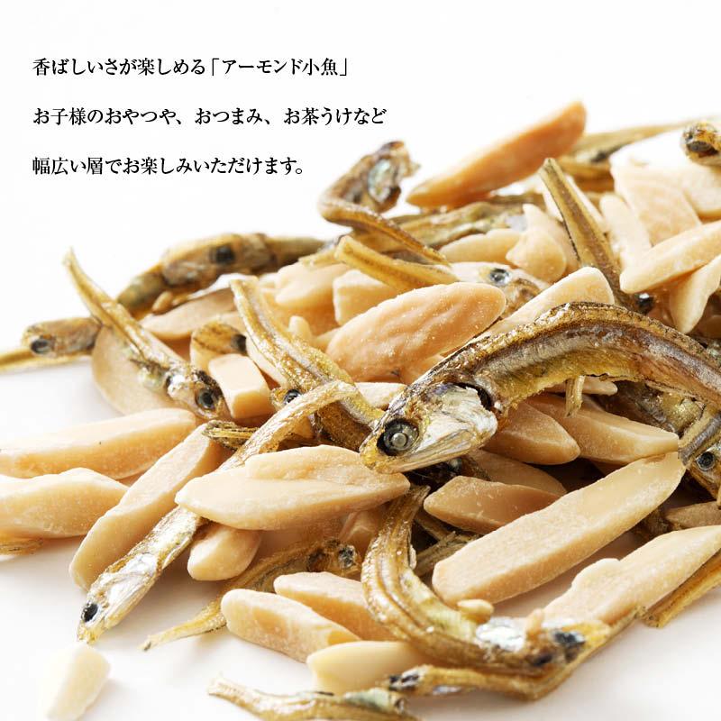 商品情報では、原材料としてアーモンド(アメリカ)、カタクチイワシ(国産)、砂糖、ごま、還元水飴、食塩が使用されており、アレルゲンとしてごま(および、えび・かにを食べているイワシ)に注意が必要です。
