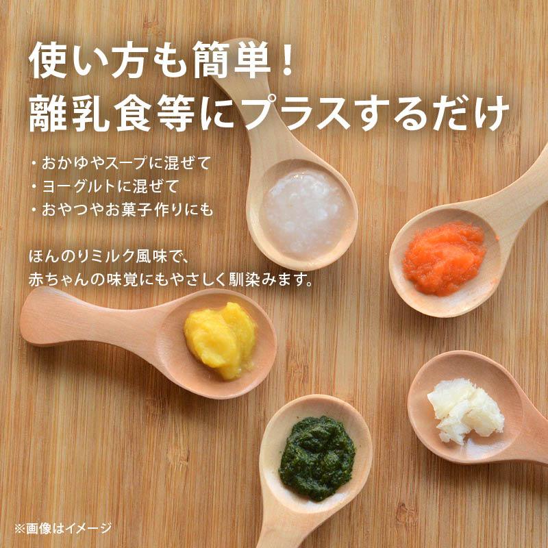 【使い方も簡単!離乳食にプラスするだけ】・おかゆやスープに混ぜて・ヨーグルトに混ぜて・おやつやお菓子作りにもほんのりミルク風味で、赤ちゃんの味覚にもやさしく馴染みます。