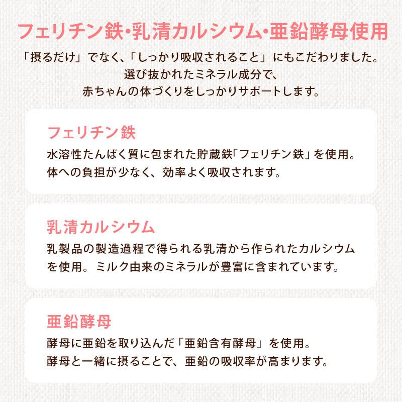 【フェリチン鉄・乳清カルシウム・亜鉛酵母使用】「摂るだけ」でなく、「しっかり吸収されること」にもこだわりました。選び抜かれたミネラル成分で、赤ちゃんの体づくりをしっかりサポートします。