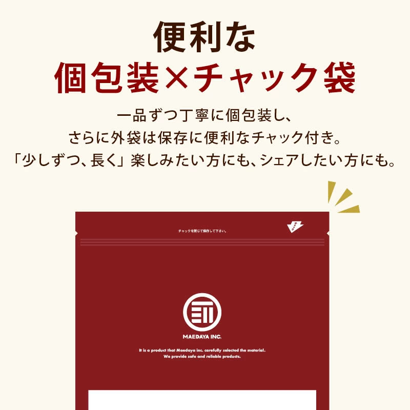 一品ずつ丁寧に個包装。さらに外袋は保存に便利なチャック付きです。