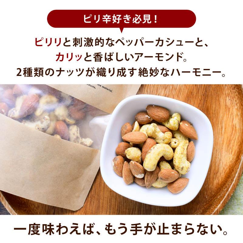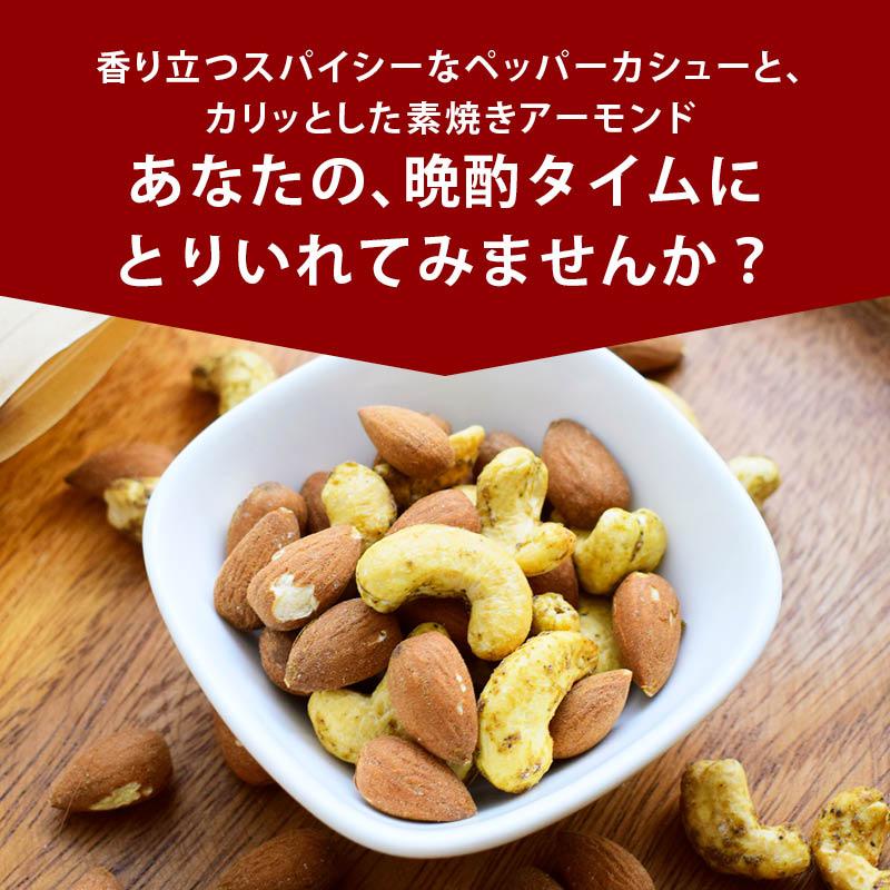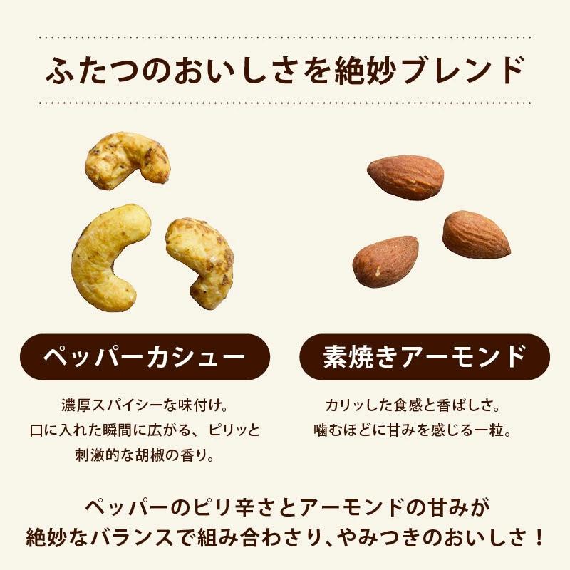 ピリ辛好き必見!ピリリと刺激的なペッパーカシューと、カリッと香ばしいアーモンド。2種類のナッツが織り成す絶妙なハーモニー。一度味わえば、もう手が止まらない。
