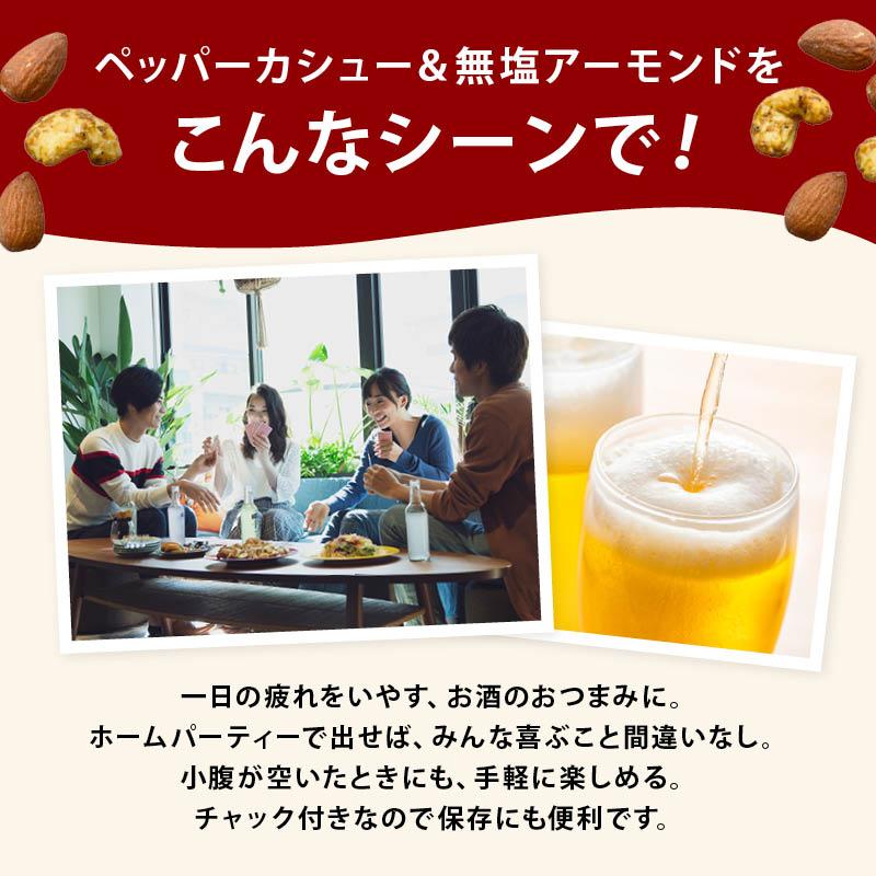 香り立つスパイシーなペッパーカシューと、カリッとした素焼きアーモンド。あなたの、晩酌タイムにとりいれてみませんか?