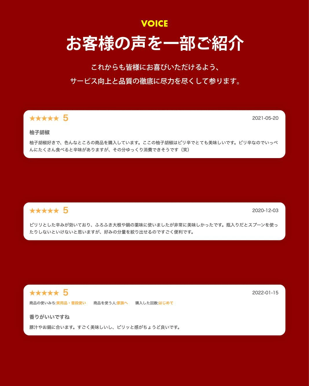 商品情報商品説明爽やかに香る、無添加・匠の柚子胡椒。湯豆腐、豚汁、味噌汁、ぎょうざ、おでん、茹でたり揚げたりした鶏肉につけたり、豚肉、鶏や牛たたき、白身魚、きのこ類、鍋などいろいろな食材と合わせられる万能調味料です。