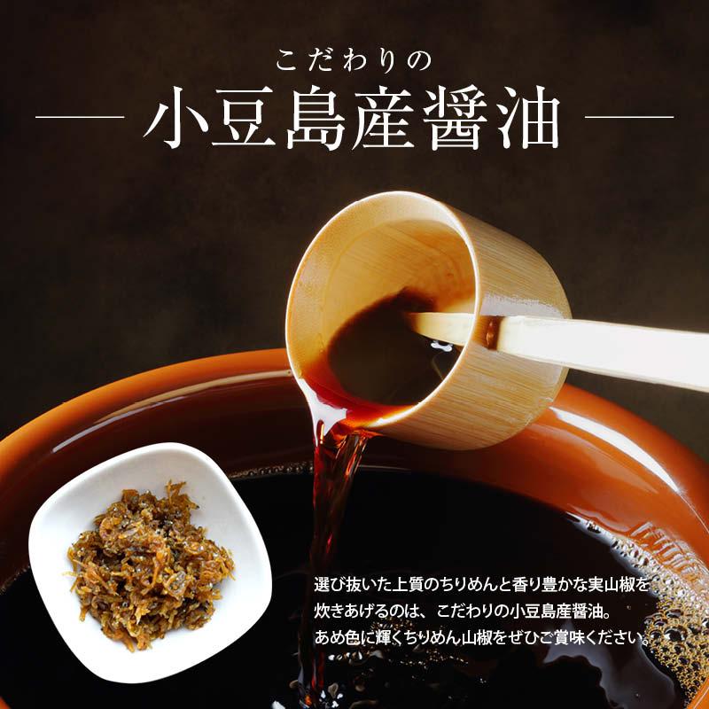 カルシウム豊富なちりめんと山椒の実を小豆島産の醤油で炊き上げました。お酒のおつまみ、混ぜご飯やおにぎりの具材など幅広くご利用いただけます。山椒の風味が食欲をそそります。