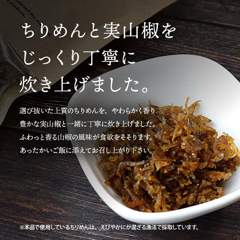 -お酒のおつまみに-しょうゆの旨味、実山椒の爽やかな香りと苦み、ちりめんの塩味が日本酒と相性抜群です。