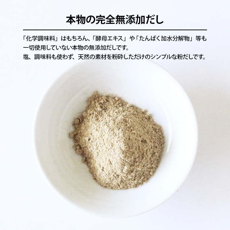 子供に、そして大切な人に、安心・安全なものを食べさせたい。そんな想いから生まれた、8種の厳選した国産素材を粉砕しただけのシンプルな粉だしです。食塩、化学調味料だけでなく、多くの無添加出汁に入っている酵母エキス、蛋白加水分解物、デキストリン等も使わず、添加物、塩、調味料は一切使用しておりません。自然素材で作っておりますので、お子様にも安心してお召し上がり頂けます。味噌汁、お吸い物、煮物、うどん、蕎麦、茶わん蒸し、鍋物等の様々な料理にお使いいただけます。粉末のため、サッと使えて便利です。また、だしがらも美味しくお召し上がりいただけます。もちろんそのままチャーハン、お好み焼き、焼きそば等に「ふりかけ」としてもお使い頂けます。