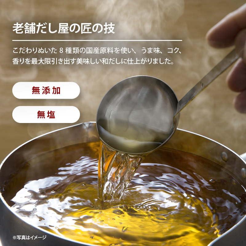1)鹿児島県枕崎産 本枯れ節 2)鹿児島県枕崎産 鰹節(荒節) 3)鹿児島県枕崎産 まぐろ節 4)長崎県産 焼あご 5)千葉県九十九里産 煮干し 6)北海道産 真昆布 7)大分・熊本・宮崎・愛媛・島根県産 原木しいたけ 8)青森県産 ほたて -ご使用方法- 水400mlに、大さじ1杯(約6g)をだしパック等に入れて煮出してください。 煮物、うどん、茶わん蒸しや鍋物、さまざまなお料理にお使いいただけます。 『香り・うまみ・コク』のバランスを活かした無添加だし。 是非、お試しください。