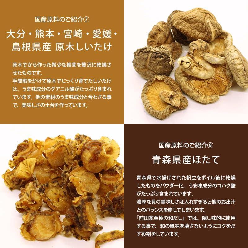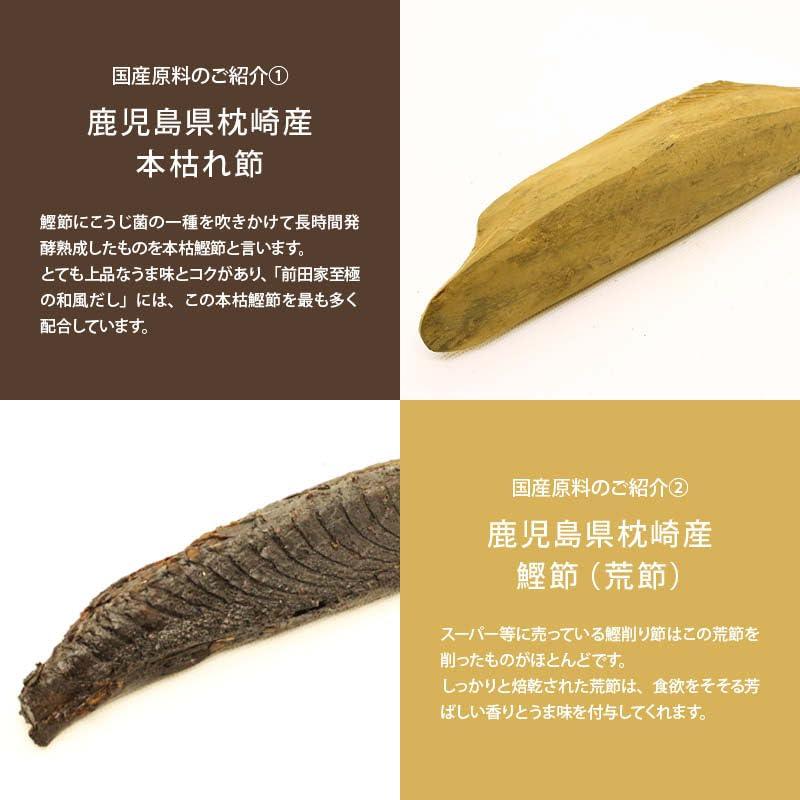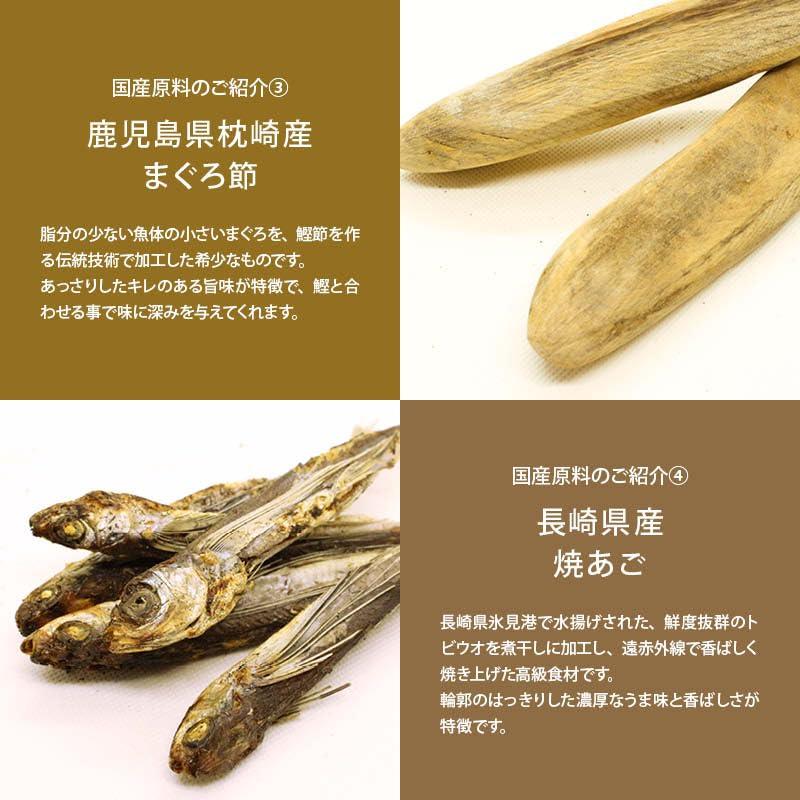 原材料:かつおのかれぶし(国内製造・枕崎産)、かつおのふし(枕崎産)、まぐろのふし(枕崎産)、焼きあご(長崎県産)、煮干し(千葉県産)、昆布(北海道産)、原木しいたけ(大分県・熊本県・宮崎県・愛媛県・島根県産)、ほたて貝(青森県産)