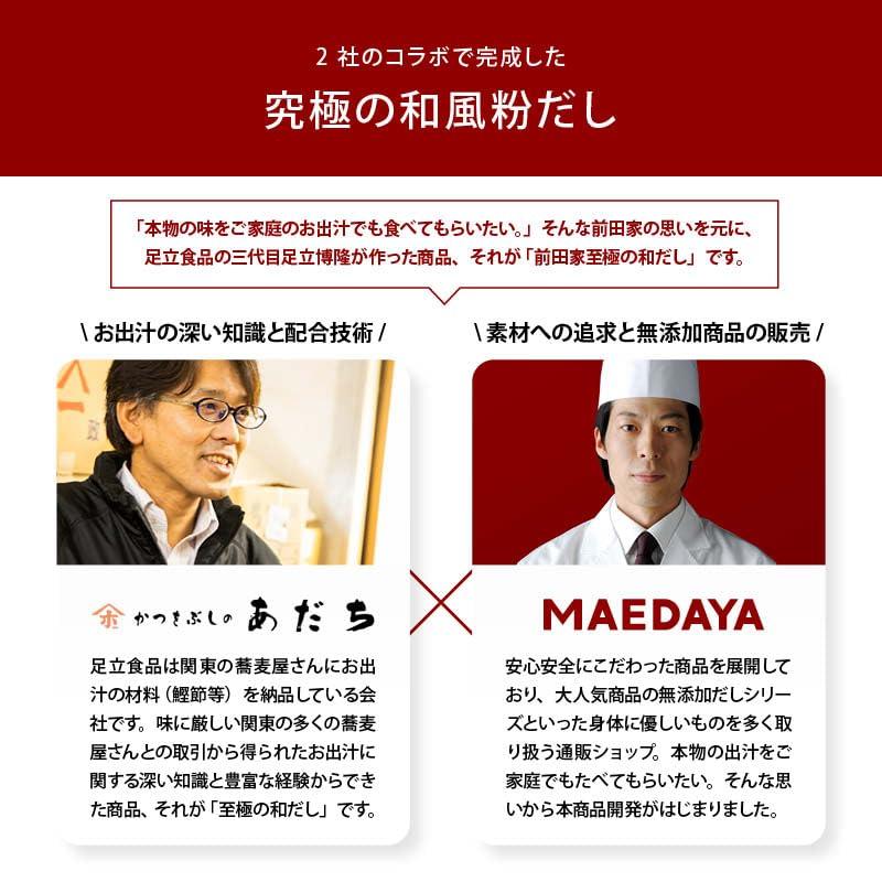 商品説明:「化学調味料」はもちろん、「酵母エキス」や「たんぱく加水分解物」等も一切使用していない無添加だしです。 塩、調味料も使わず、天然の素材を粉砕しただけのシンプルな粉だしです。 -2社のコラボで完成した究極の和風粉だし- 「本物の味をご家庭のお出汁でも食べてもらいたい。」そんな前田家の思いを元に、 足立食品の三代目足立博隆が作った商品、それが「前田家至極の和だし」です。 『かつおぶしのあだち』 お出汁の深い知識と配合技術。 足立食品は関東の蕎麦屋さんにお出汁の材料(鰹節等)を納品している会社です。 味に厳しい関東の多くの蕎麦屋さんとの取引から得られたお出汁に関する深い知識と豊富な経験からできた商品、それが「至極の和だし」です。 『MAEDAYA』 素材への追及と無添加商品の販売 大人気商品の無添加だしシリーズといった身体に優しいものを多く取り扱う通販ショップ。 本物の出汁をご家庭でもたべてもらいたい。そんな思いから本商品開発がはじまりました。 こだわりぬいた8種類の国産原料を使い『うまみ・コク・香り』を最大限引き出す、美味しい和だしに仕上がりました。