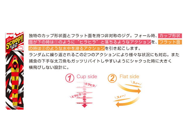 独特のカップ形状面とフラット面を持つ非対称のジグ。