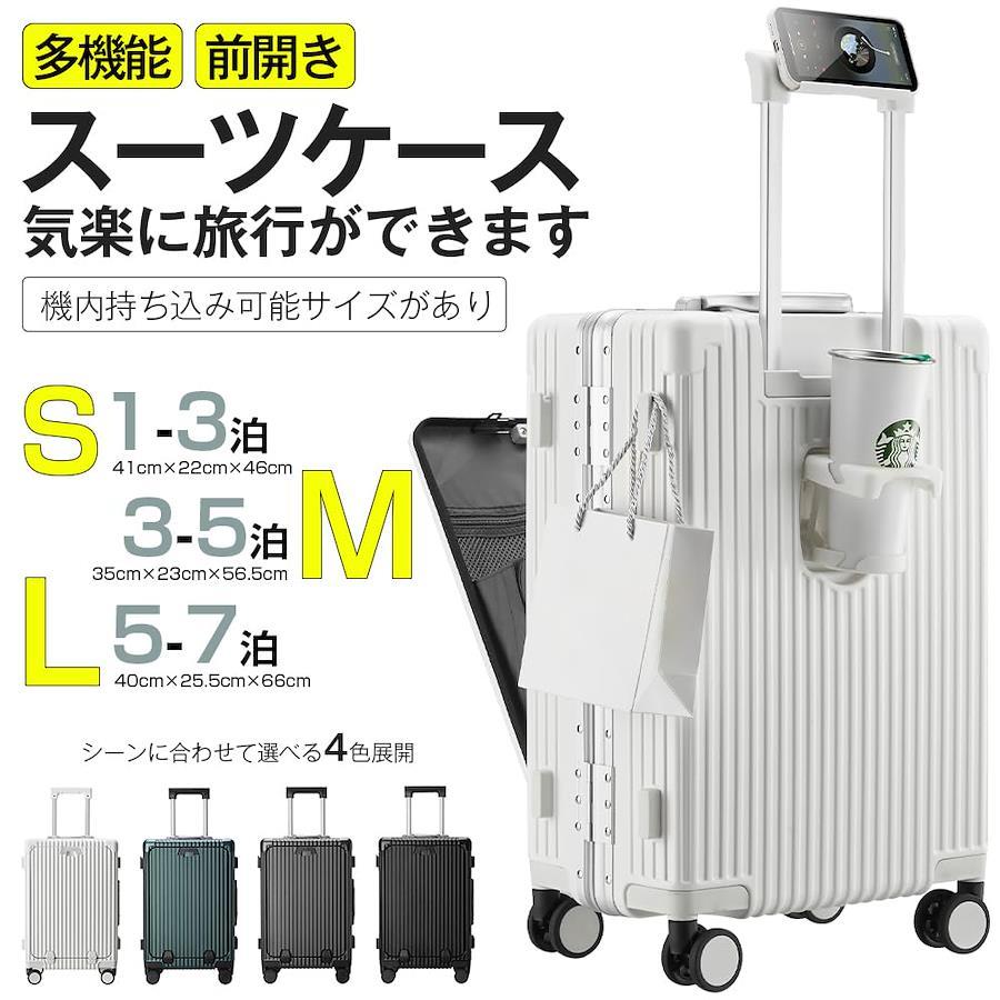 「耐久性抜群、頑丈なPC素材を採用したスーツケース」:弊社のキャリアケースは、軟鋼板と呼ばれるPC素材を使用しています。PC素材の耐圧縮性、弾力性に優れており、スーツケースは高いところから落ちるても、重いもので押せられても、元の状態を維持することができます。さらに、スーツケースのランクは、より耐久性と安全性の高いアルミフレームが採用されています。スーツケースは3層の複合材で構成されており、強度をより高めています、スーツケースの中の大切な荷物を保護し、長期間使用できるようにします。 また、キャリアケースの表面は丁寧に塗装され、高級感のある光沢に仕上がっています。 「USB+Type C充電ポート、カップホルダーとスマホルダーを付く、前開きキャリアバッグ」パソコンが出し入れやすいように、スーツケースには前開きポケットがあり、空港や職場でPCを素早く取り出せるようになっています。カップを置きるため、キャリアバッグの後部に折りたたみ式のカップホルダーを設けています。スーツケースには高さ調節可能なレバーがあり、レバーの上部にはスマホルダーが付いているので、フライトの待ち時間に両手が自由になり、外出先でもリラックスできます。さらに、スーツケースにはUSB+Type-Cデュアル充電ポート、3種類の充電ケーブルを内蔵しています。各機種に対応したデュアル充電ポート、モバイルバッテリーポーチを用意しました。 「世界標準のTSAロックを採用したスーツケース」弊社のスーツケースには世界標準のTSAロックが装着されており、ロックしたまま荷物を預けることができ、税関を早めに通ります。 コンビネーションロックとメカニカルキーの多重保護で、荷物の安全性はさらに高まります。キャリアバッグ内部の右に乾湿分離のデザインなので、旅行時、使用したおしぼりや汚れた服などは他の生活用品と分けて収納でき、より清潔で衛生的です。 「多段調節可能レバーと輪待望久しいストッパー」お客様のご要望に応じてキャスターを改良しました、皆様待望久しいストッパーを付いていました!なお、スーツケースは360度自由回転の静音万向輪を使って、口径を大きくしてキャスターの静音性、安定性、耐久性を向上させました。デコボコの道路も斜面も滑らかに走ることができます。軽量かつ頑丈なアルミ製のラバーは、多段調節可能のデザイン、様々な身長の人に合っていて、男女問わず利用