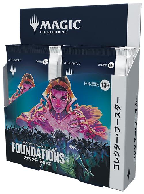 多元宇宙へようこそ――マジックで特に人気のキャラクターや蘇るゾンビ、猫、統率された軍団、古代の力などとの出会いをお楽しみください。マジックのベスト盤とも言うべきこのセットは、マジックのカードコレクションの第一歩にうってつけです。アート、ストーリー、ストラテジーが一体となったゲーム――マジック:ザ・ギャザリングは、舞台となる世界や物語を味わえるアートやメカニズムを使い、奥深い戦略が繰り広げられるカードゲームです。友人と気軽に遊びたい方も、素敵なカードをコレクションしたい方も、競技志向の方も、マジックは皆さんが「集まる」ことを大いに歓迎します。プレイしても眺めてもよしの珠玉のカード――コレクター・ブースターには、特にクールなカードが詰まっています。特別なカード仕様や輝くフォイル仕様、そして強力なレアや神話レアがあなたのコレクションを飾る新たな宝玉となるでしょう。特別なフレームのカードを集めよう――美しいアートがカードの枠いっぱいに広がるボーダーレス版や拡張アート版が、少なくとも3枚封入されています。人気の再録カードが新たなアートのボーダーレス版で出現する可能性もあります。限定のフォイル仕様――『ファウンデーションズ』コレクター・ブースター限定で、これまでにない特別なフォイル仕様のボーダーレス版のレアや神話レアが出現する可能性があります。シンプルにベストなカードを――各コレクター・ブースターには、レア以上のカードが5枚封入されています。マジックの歴史を彩る別フレーム版のスペシャルゲストの神話レア・カードが出現する可能性もあります。コレクター・ブースターボックスの内容――『ファウンデーションズ』コレクター・ブースター12パック(各パックにマジックのカード15枚入り)