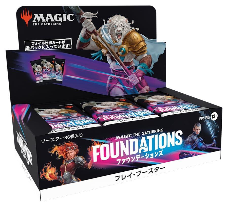 友人と遊ぶのに最適なブースター――お気に入りの色の組み合わせでデッキを組んだり、友人とドラフトを楽しんだりしましょう。プレイ・ブースターは、どのようにプレイしても楽しめるようにバランスが取れています。シンプルにベストなカードを――今日のマジックを作ったカードの数々をプレイし、美しいカードアートがふちまで広がるボーダーレス版カードが手に入るパックを開封しましょう。人気の再録アードが新たなアートで出現する可能性もあります。レアや神話レアのカードを集めよう――各プレイ・ブースターには、レア以上のカードが1~4枚封入されています。マジックの歴史を彩る美しいカード仕様で飾られたスペシャルゲスト・カードが出現する可能性もあります。すべてのパックに輝くフォイル仕様カード入り――各プレイ・ブースターには、フォイル仕様の不特定レアリティのカードが少なくとも1枚封入されています。さらに20%の確率で、フォイル仕様の土地カードが出現します。プレイ・ブースターボックスの内容――『ファウンデーションズ』プレイ・ブースター36パック。各パックにマジックのカード14枚とトークン/広告カードまたはアート・カード1枚入り。
